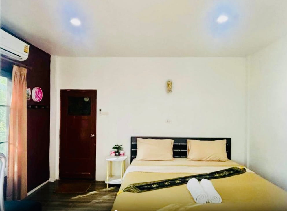 AC Wood Bungalow with double bed, table, chair, wardrobe, wi-fi and en suite bathroom. These rooms are bright and spacious with large glass sliding doors onto balcony overlooking the beach. Simply decorated and newly renovated in quiet resort.